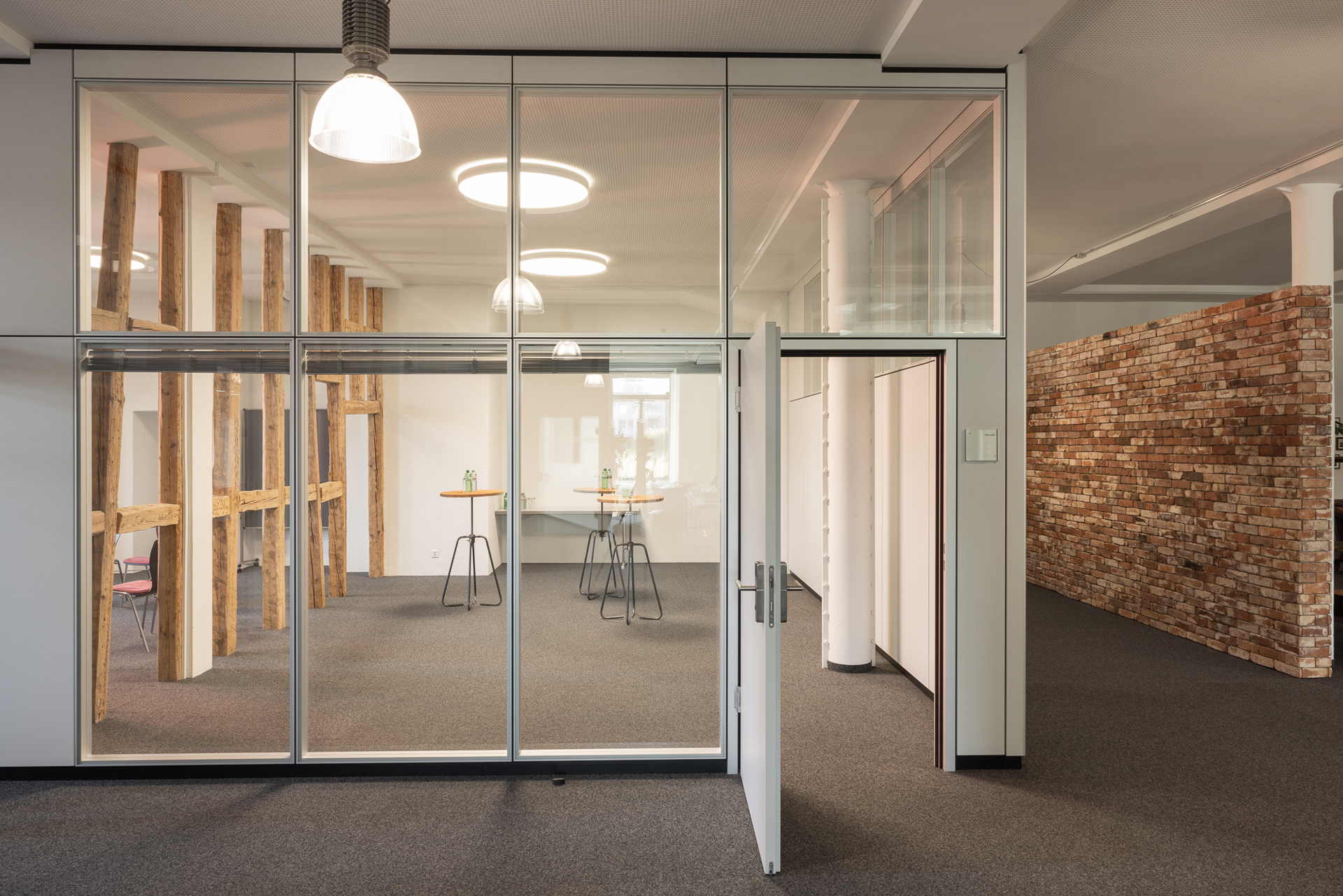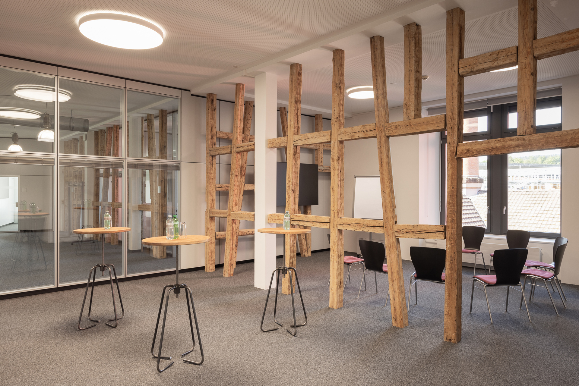 Der Lettensaal 6 ist mit seinen alten Holzbalken ein Meeting Raum mit speziellem Flair. Diese Holzbalken trennen den Raum dezent in zwei Bereiche und bietet so einen kleinen Vorraum, welcher als Kaffeepausen Ecke oder zusätzlichen Arbeitsraum genutzt werden kann. Ausgestattet mit einem grossen Konferenztisch sowie einem LCD-Screen bietet er verschieden Set Up Möglichkeiten.