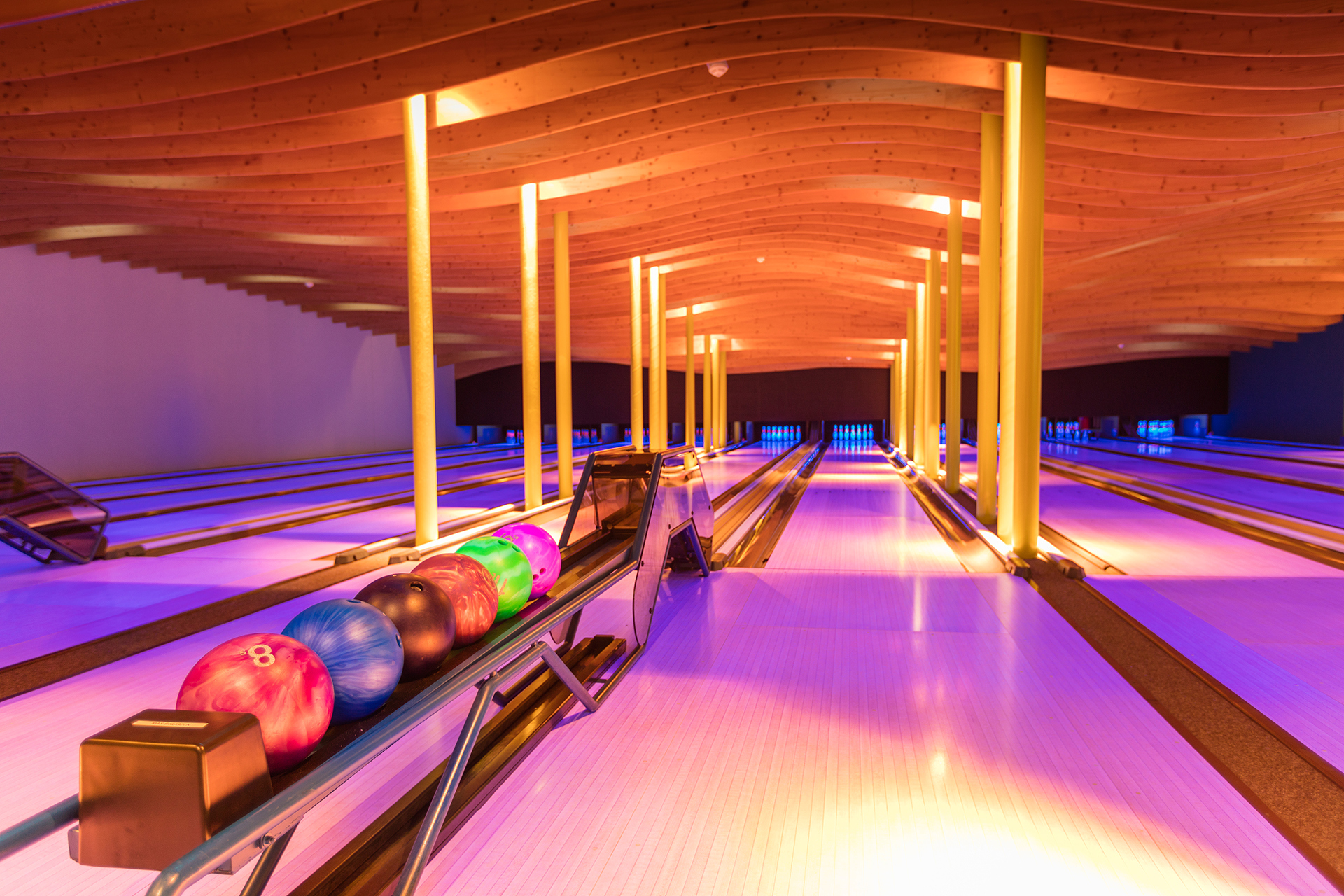 Our bowling centre with its 800m2, offers 10 modern bowling alleys. The riverbar and the lounge is the perfect place to unwind and enjoy a relaxing evening or even watch an exciting sports event live on one of the numerous TV-Screens. The bowling centre can be booked exclusively for any sort of event.