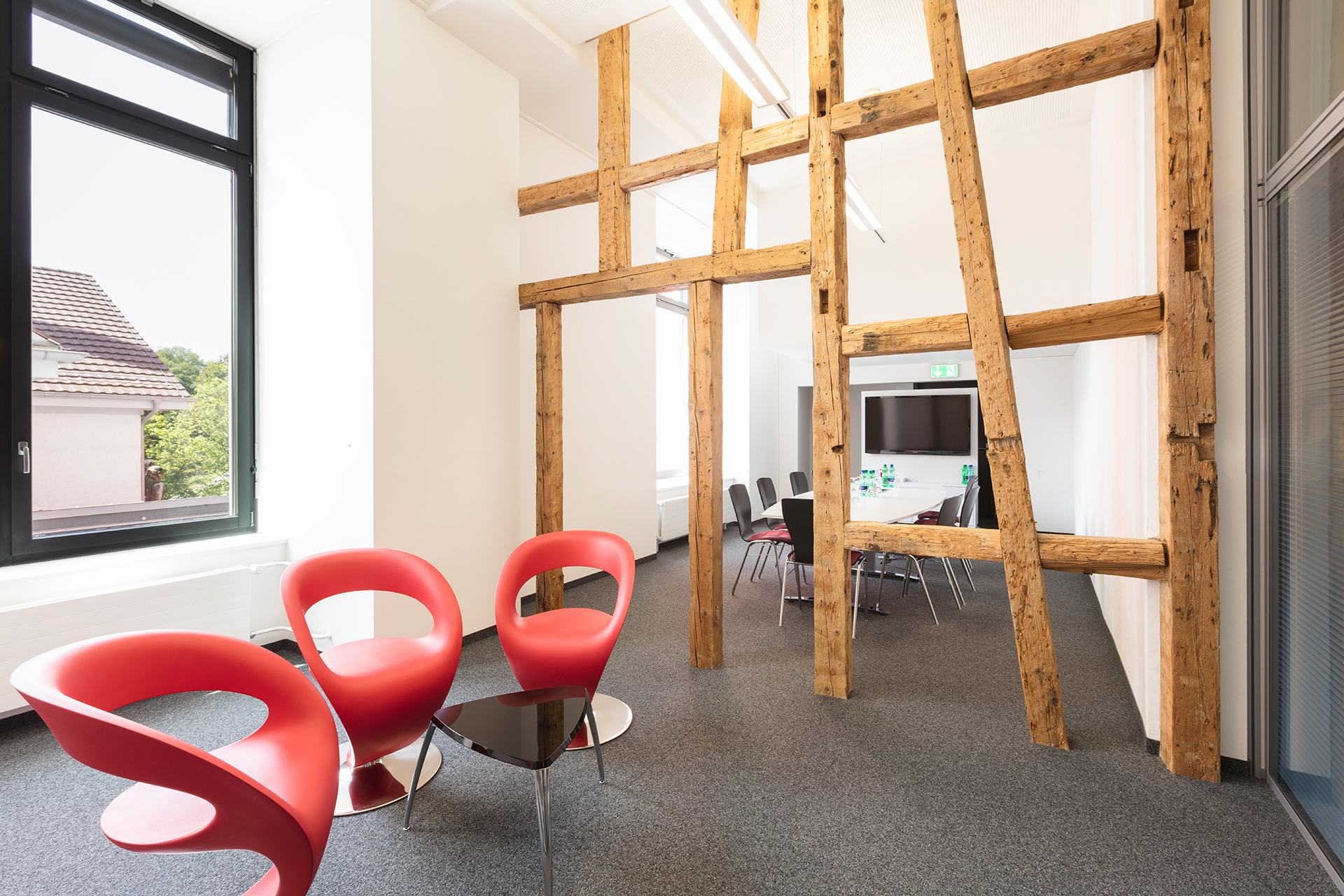 Säulensaal 8 has the charm of a Swiss Chalet. The original woodwork separates the room in two and create a small vestibule. It is also equipped with a big conference table and an LCD screen and has the perfect setting for meetings and workshops.
